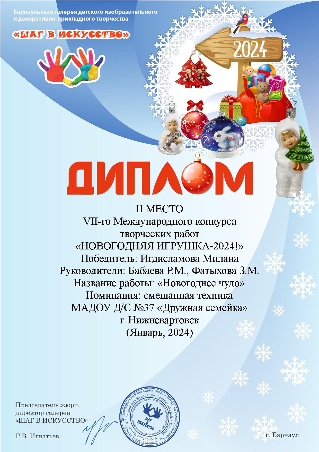 Диплом 2 место VI-го Международного конкурса творческих работ "Новогодняя игрушка-2024!", название работы "Новогоднее чудо" в номинации: смешанная техника (Просмотр)