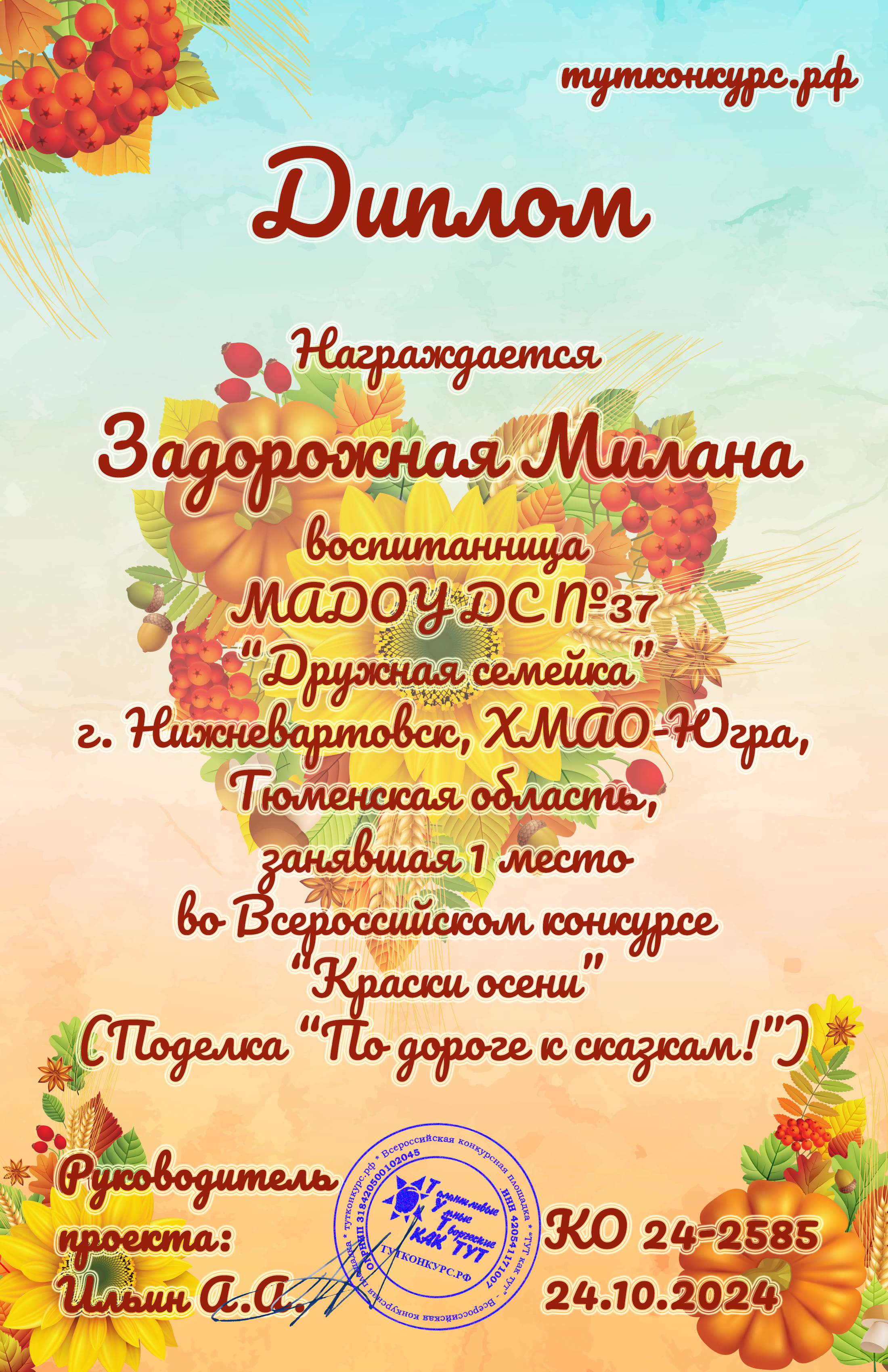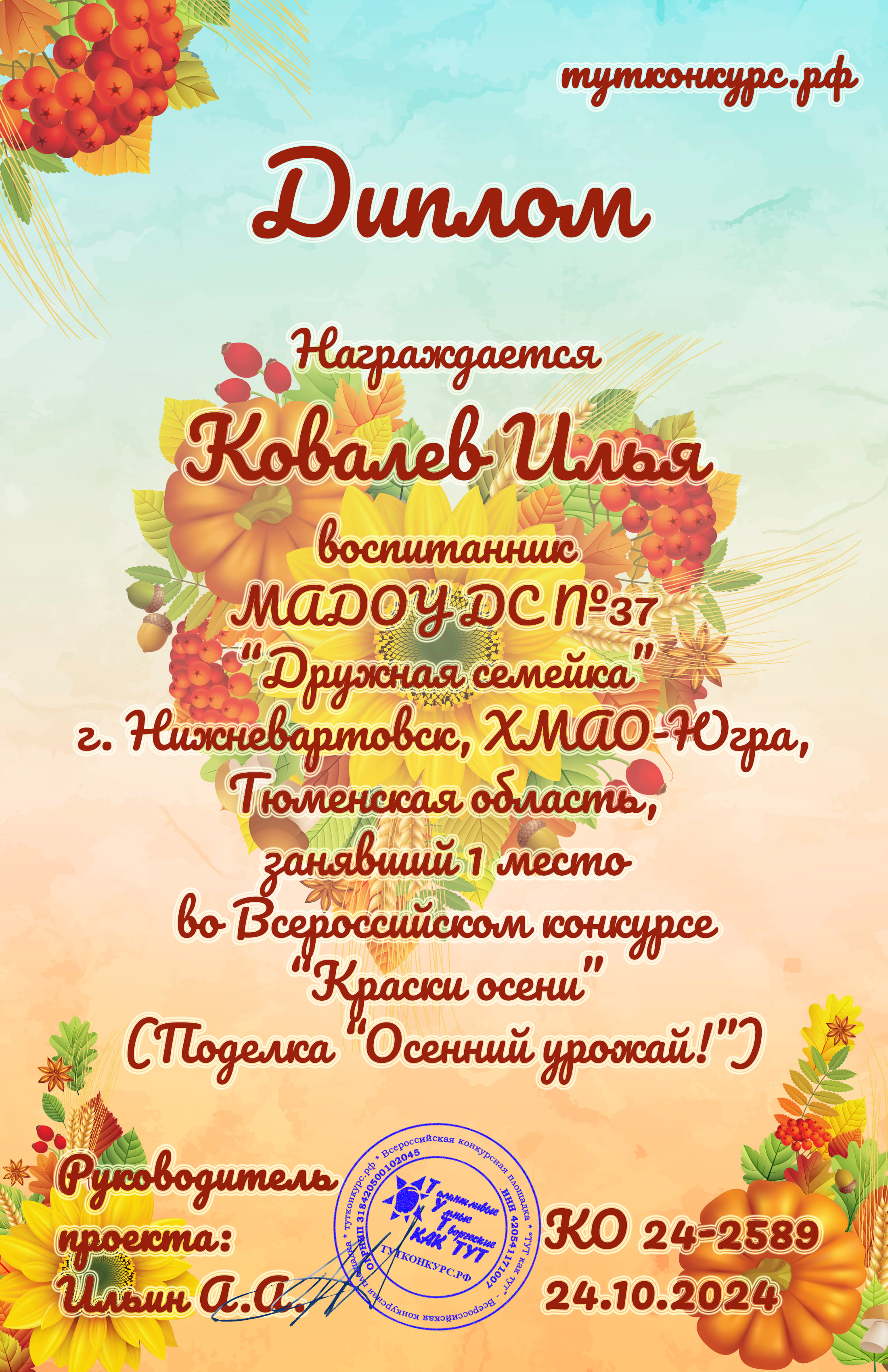 Диплом 1 место во Всероссийском конкурсе "Краски Осени" в номинации декоративно-прикладного искусства "Осенний урожай" (Просмотр)