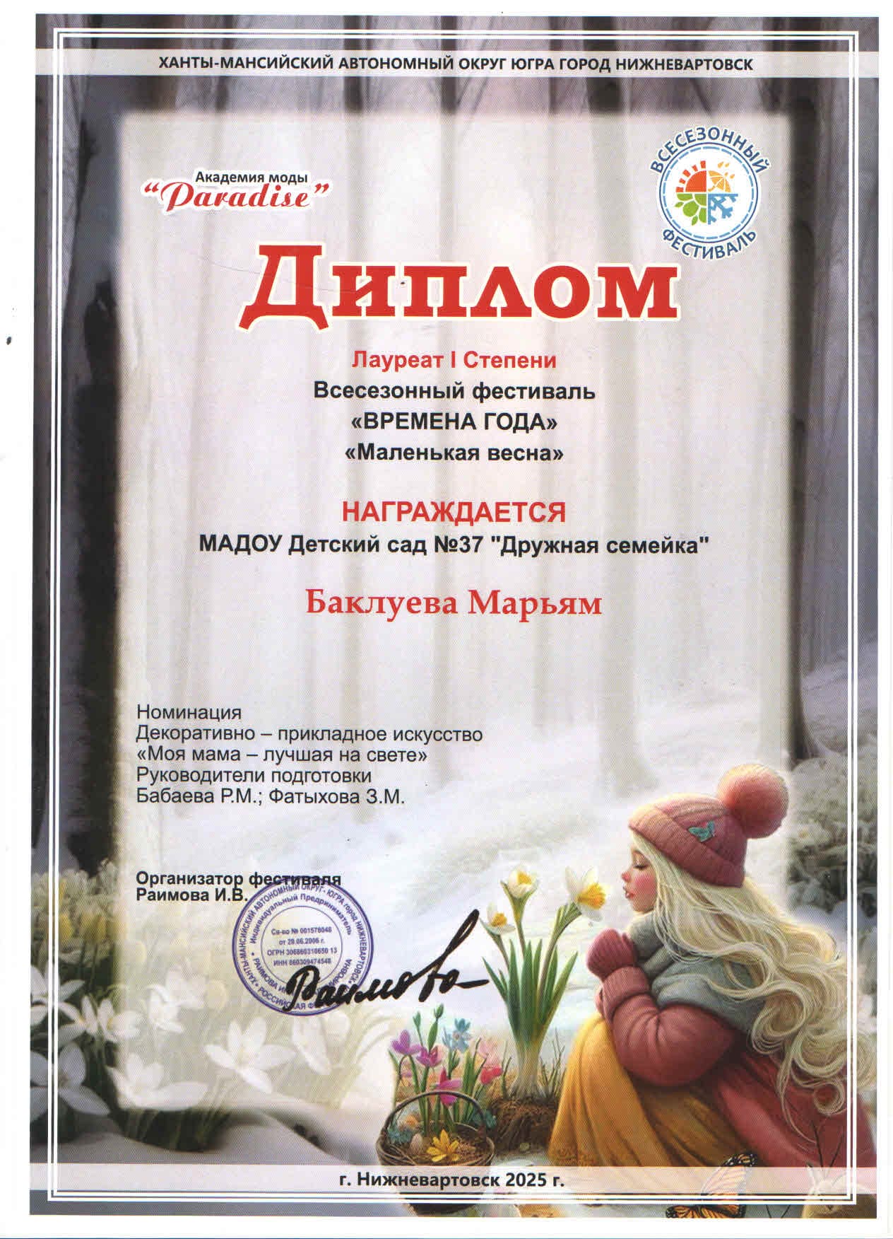 Диплом Лауреата I степени Всесезонного фестиваля "Времена года" "Маленькая Весна" в номинации: "Декоративно-прикладное искусство" "Моя мама-лучшая на свете" (Диплом)