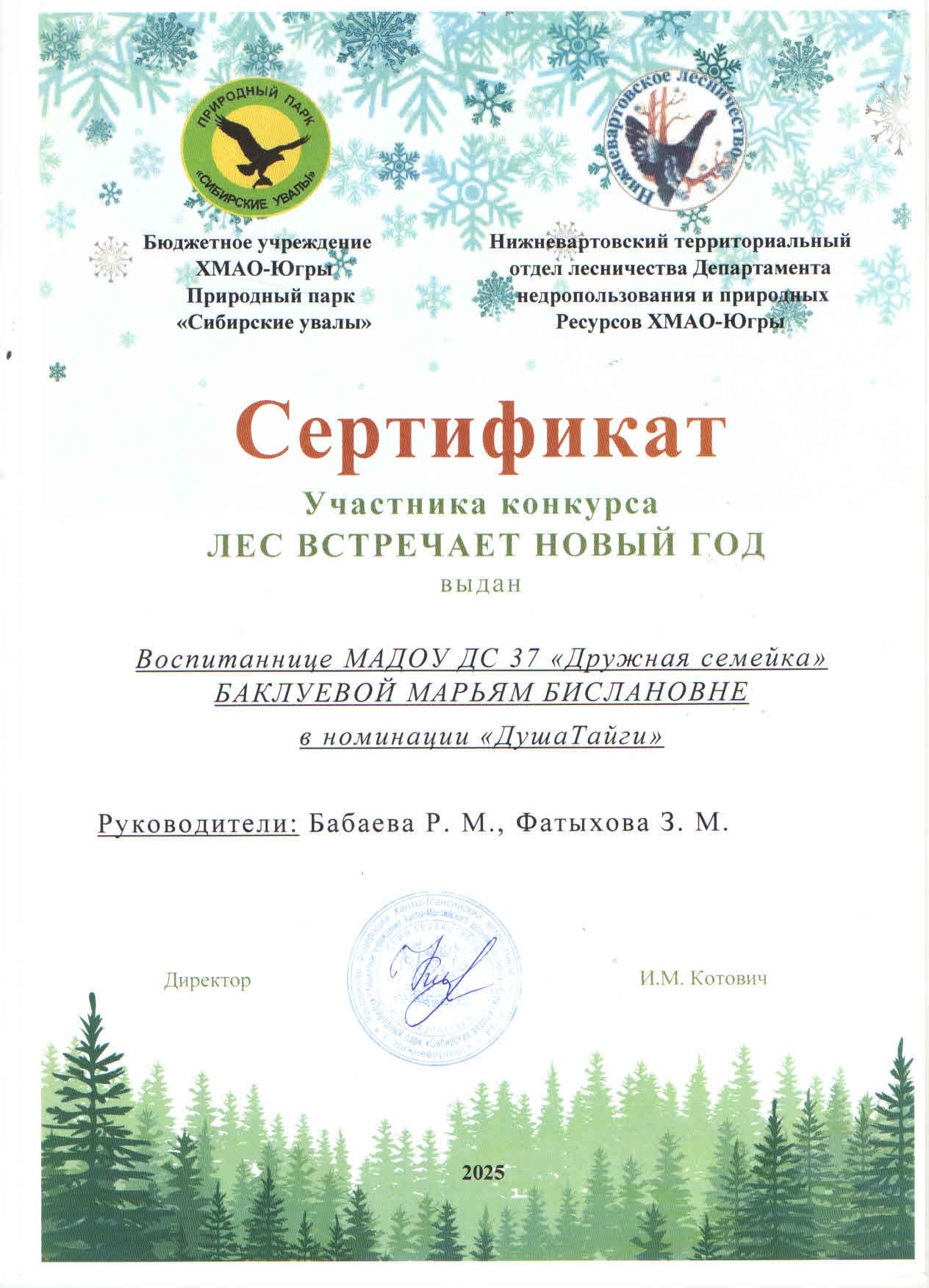Сертификат участника в городском конкурсе "Лес встречает Новый год" в номинации "Душа Тайги" (Просмотр)