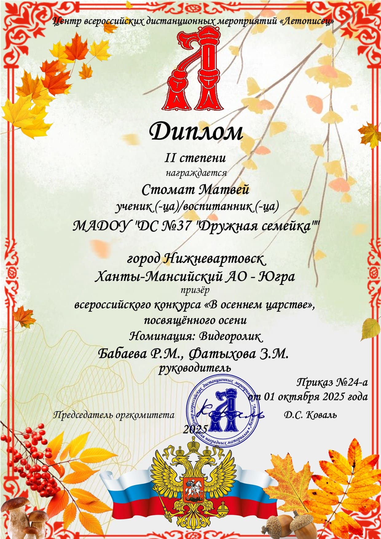 Диплом II степени Всероссийского конкурса "В осеннем царстве" в номинации видеоролик (Просмотр)