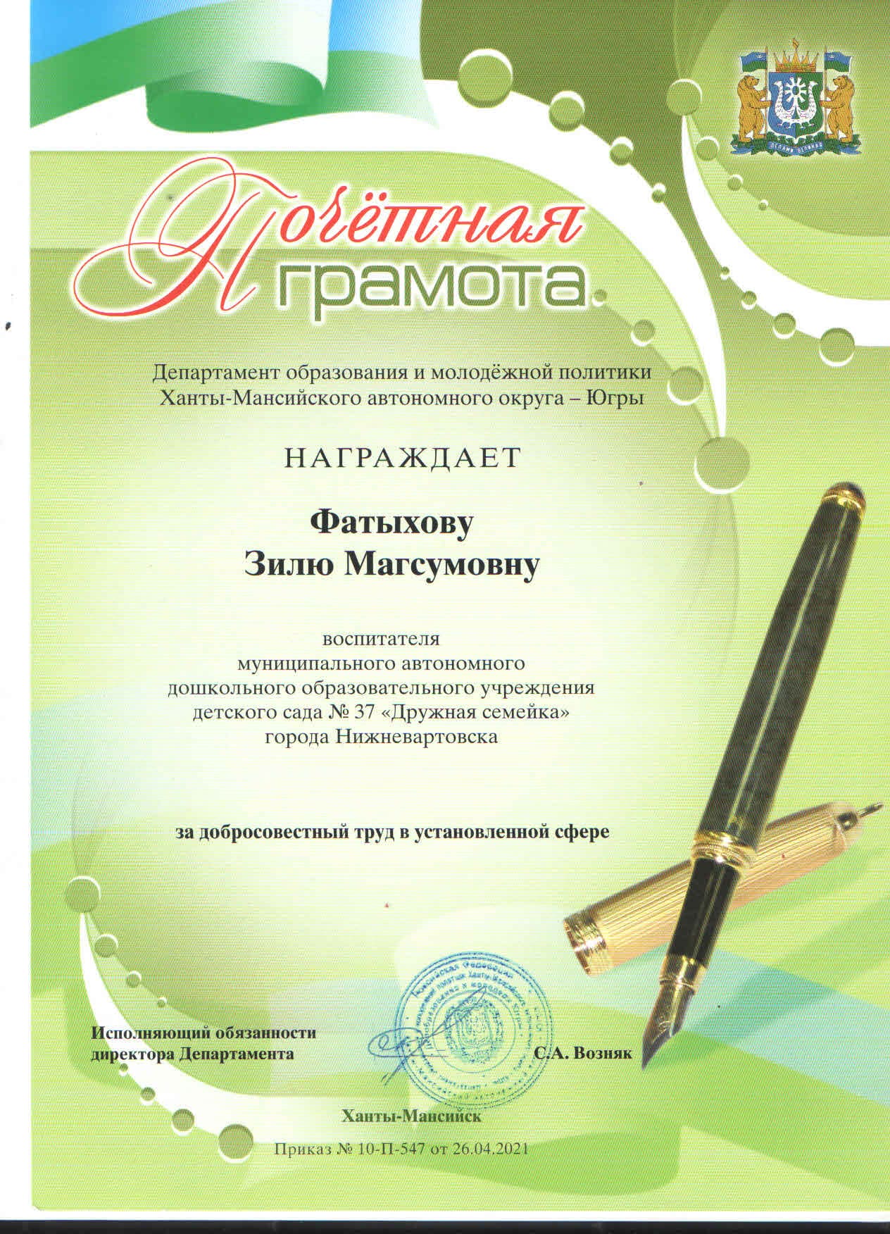 Почетная грамота от "Департамента образования и молодежной политики ХМАО-Югра за добросовестный труд в установленной сфере", 2021 г. (Просмотр)