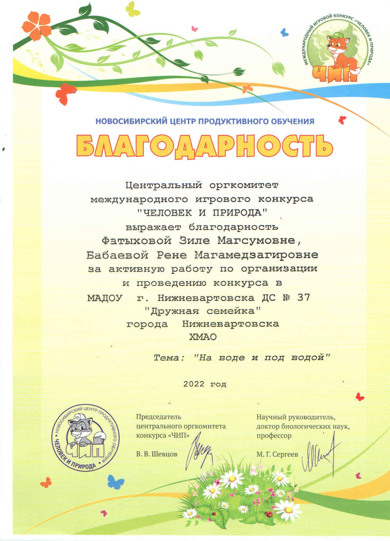 Благодарность за активную работу по организации и проведения международного игрового конкурса "Человек и природа" на тему: "На воде и под водой" (Просмотр)