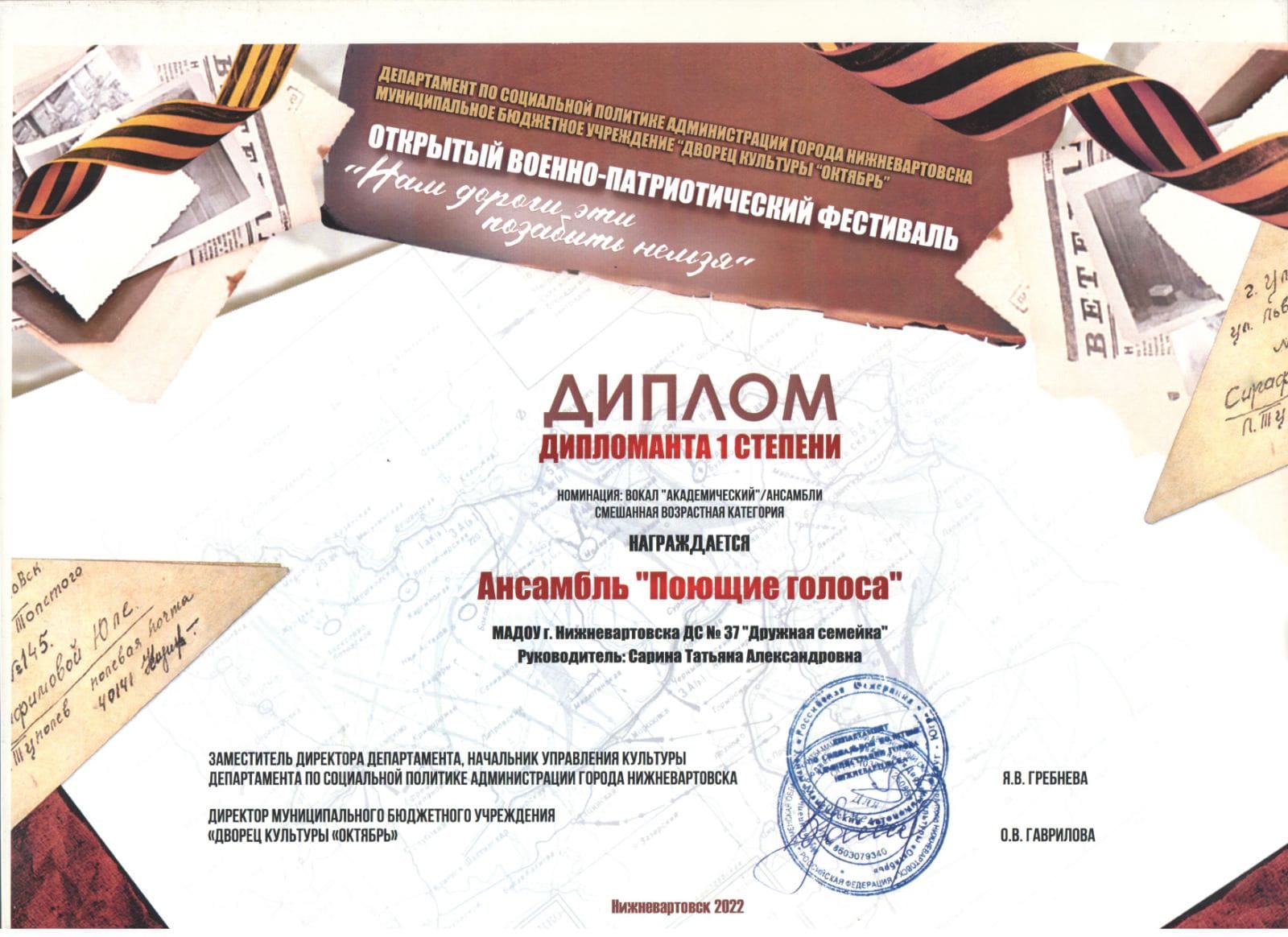 Диплом дипломанта I степени в городском открытом военно-патриотическом фестивале "Нам дороги эти позабыть нельзя". Номинация: Вокал "Академический ансамбль" "Поющие голоса" (Просмотр)