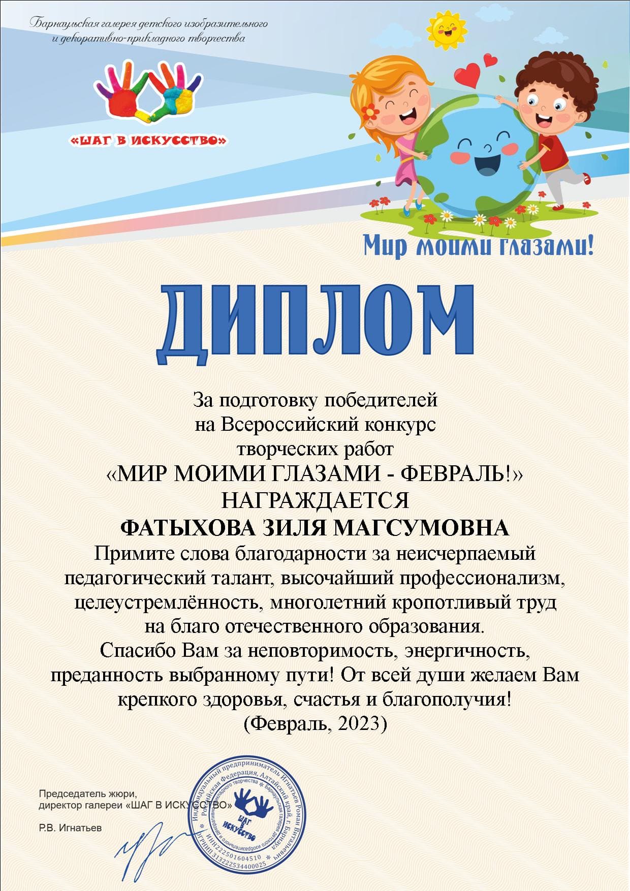 Диплом за подготовку победителей на Всероссийский конкурс творческих работ "МИР МОИМИ ГЛАЗАМИ-ФЕВРАЛЬ!" (Просмотр)