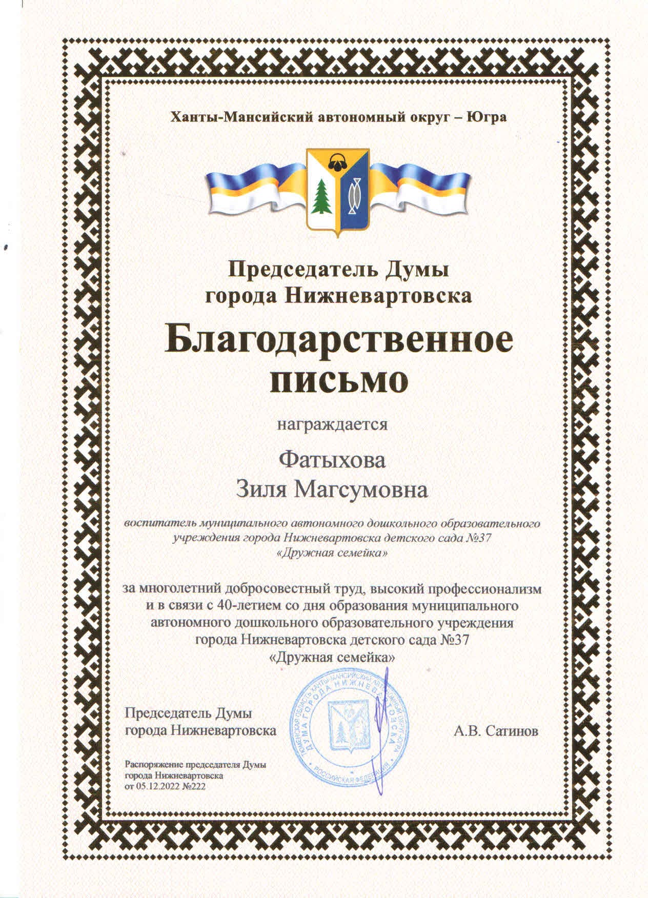 Благодарственное письмо от Председателя Думы города Нижневартовска (Просмотр)