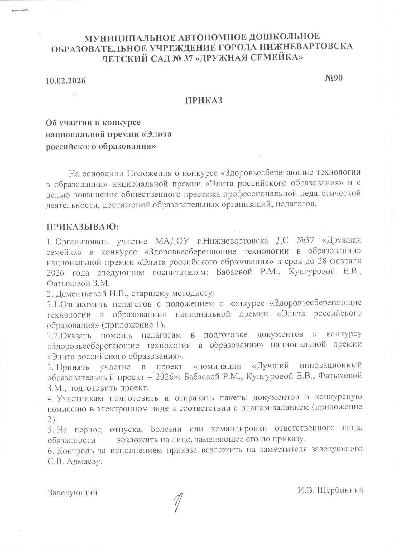 2026 год Приказ № 90 от 10.02.2026 г. Об участии в конкурсе Национальной премии "Элита Российского образования" (Просмотр) |