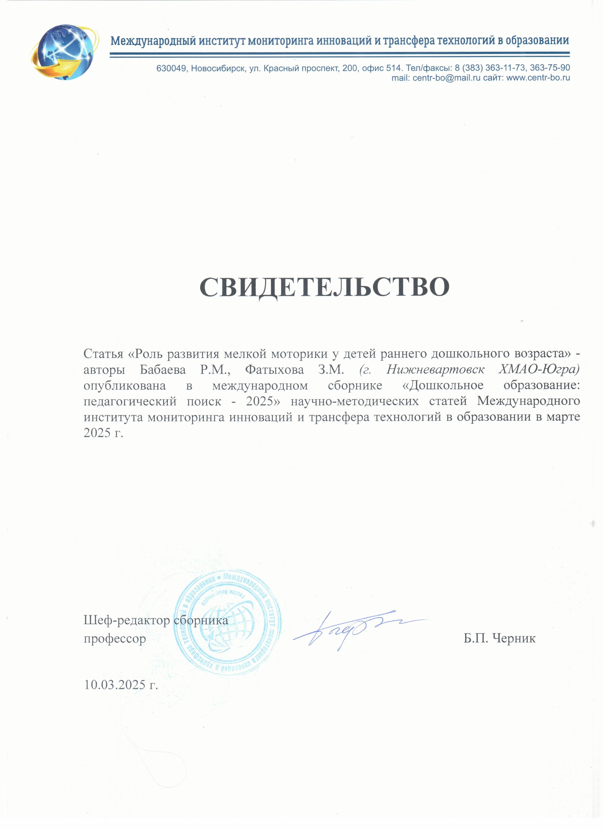 Свидетельство о публикации СТАТЬИ "Роль развития мелкой моторики у детей раннего дошкольного возраста" в МЕЖДУНАРОДНОМ сборнике "ДО: педагогический поиск-2025" (Просмотр)