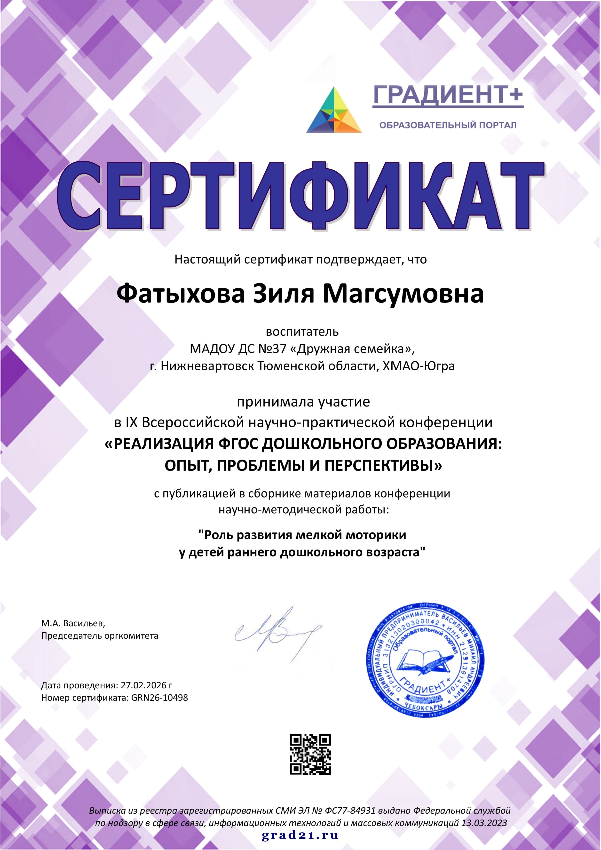 Сертификат участия в IX Всероссийском научно-практической конференции "Реализация ФГОС ДО:опыт, проблемы и перспективы" с публикацией в сборнике материалов конференции научно-методической работы: "Роль развития мелкой моторики у детей раннего дошкольного возраста", 2026 г. (Просмотр) Сборник (Просмотр)
