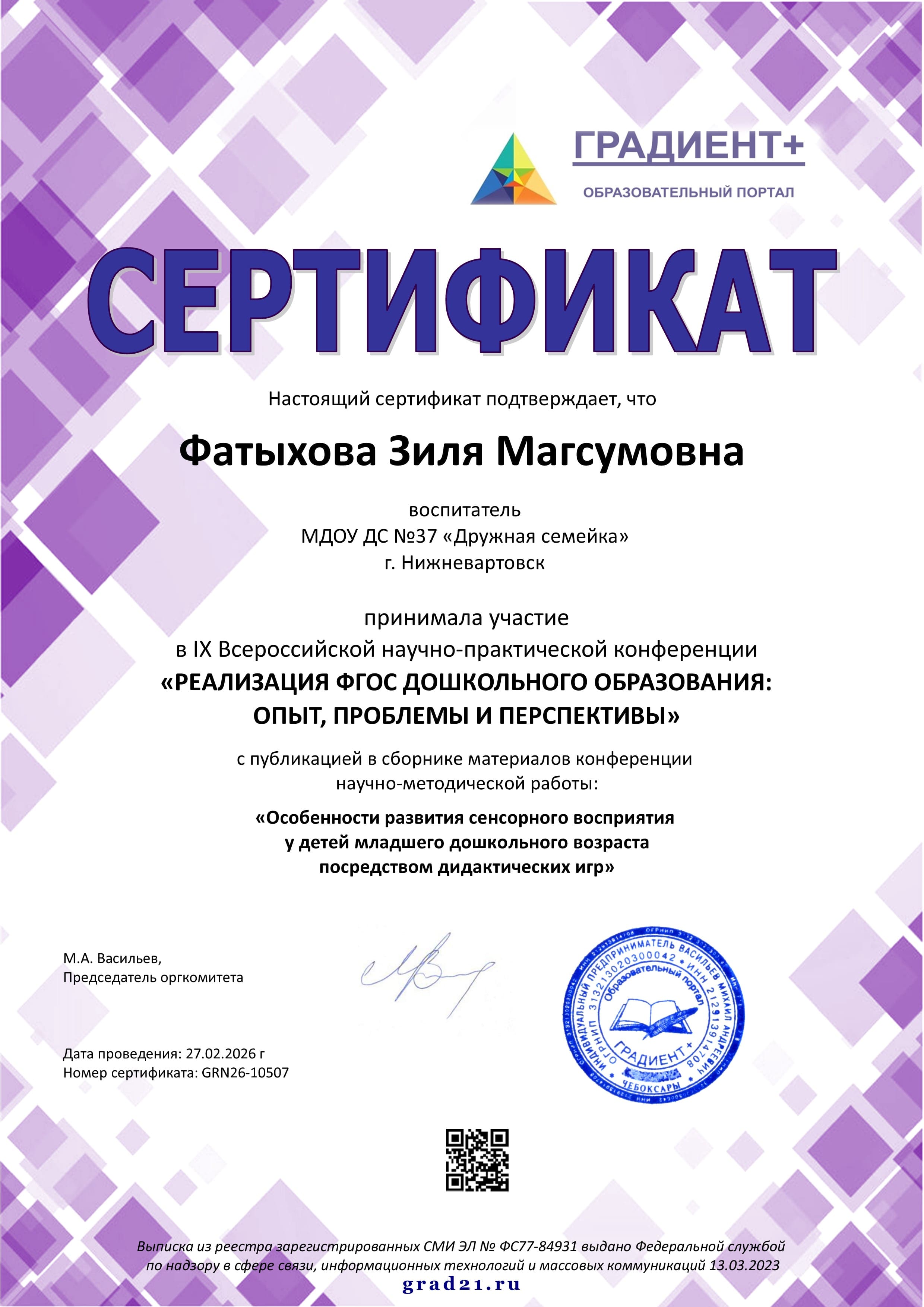 Сертификат участия в IX Всероссийском научно-практической конференции "Реализация ФГОС ДО:опыт, проблемы и перспективы" с публикацией в сборнике материалов конференции научно-методической работы: "Особенности развития сенсорного восприятия у детей младшего дошкольного возраста посредством дидактических игр", 2026 г. (Просмотр) Сборник (Просмотр)