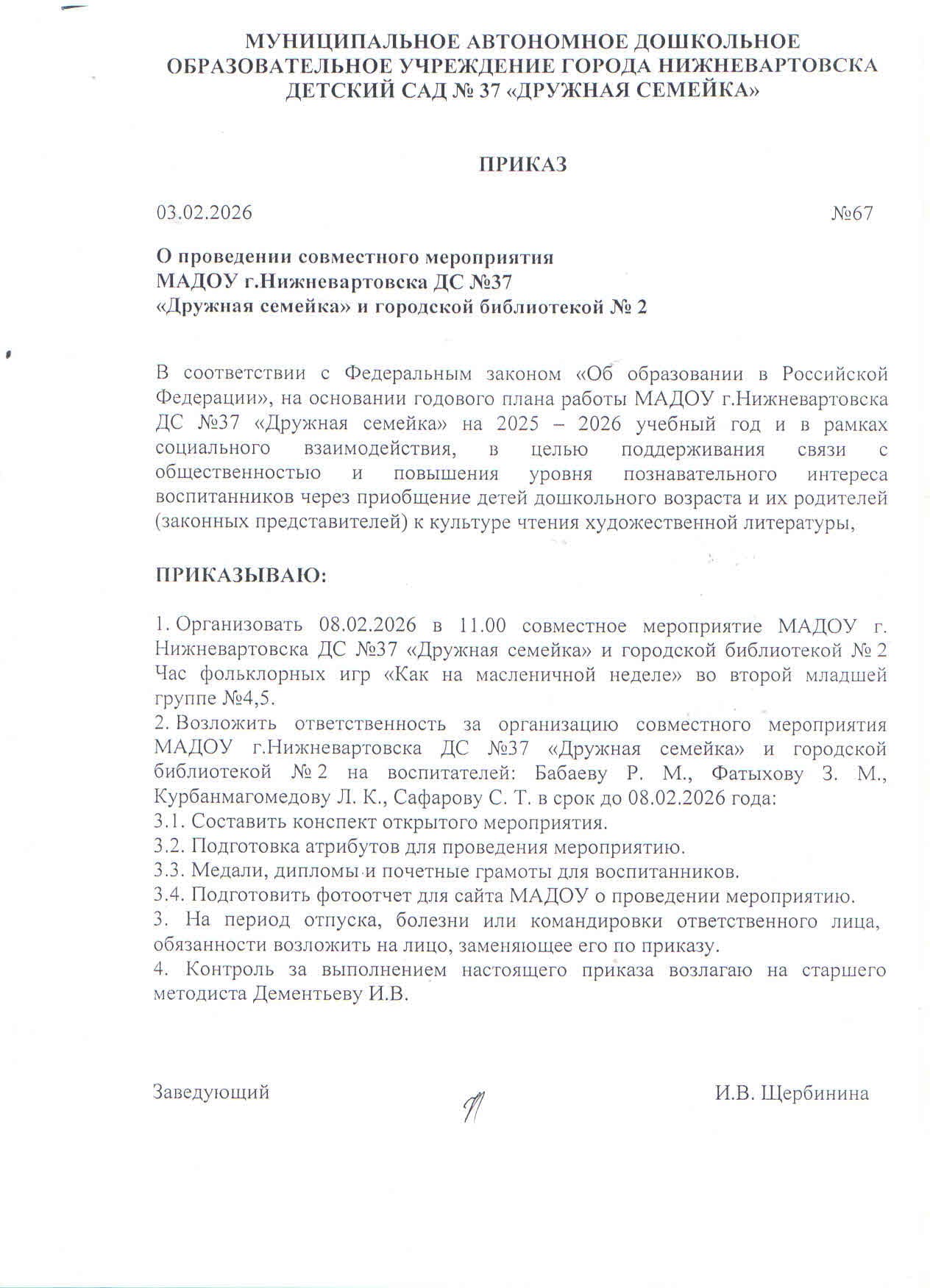 Приказ № 67 от 03.02.2026 г. О проведении совместного мероприятия МАДОУ г.Нижневартовска ДС №37 "Дружная семейка" и городской библиотекой " № 2 (Просмотр) Мероприятие с городской детской библиотекой № 2 "Час фольклорных игр, как на масленичной неделе" (Просмотр)